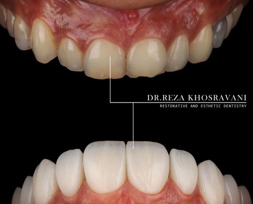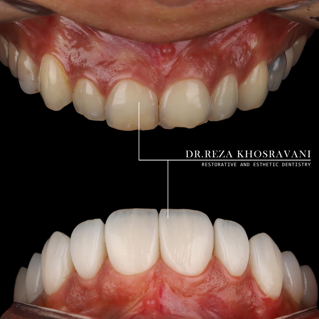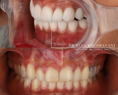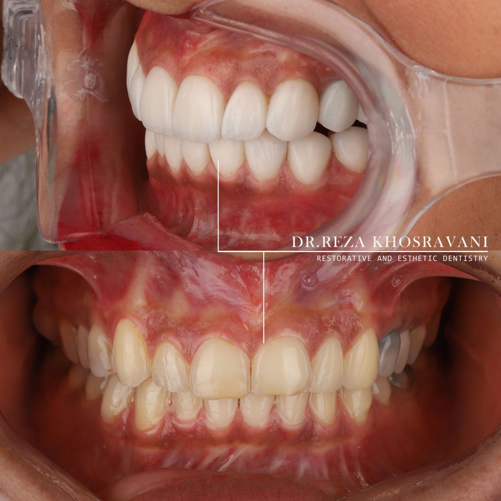 علت مراجعه: نارضایتی بیمار از دندانها در خط لبخند به علت بهم ریخته گی و نداشتن قوس دندانی
